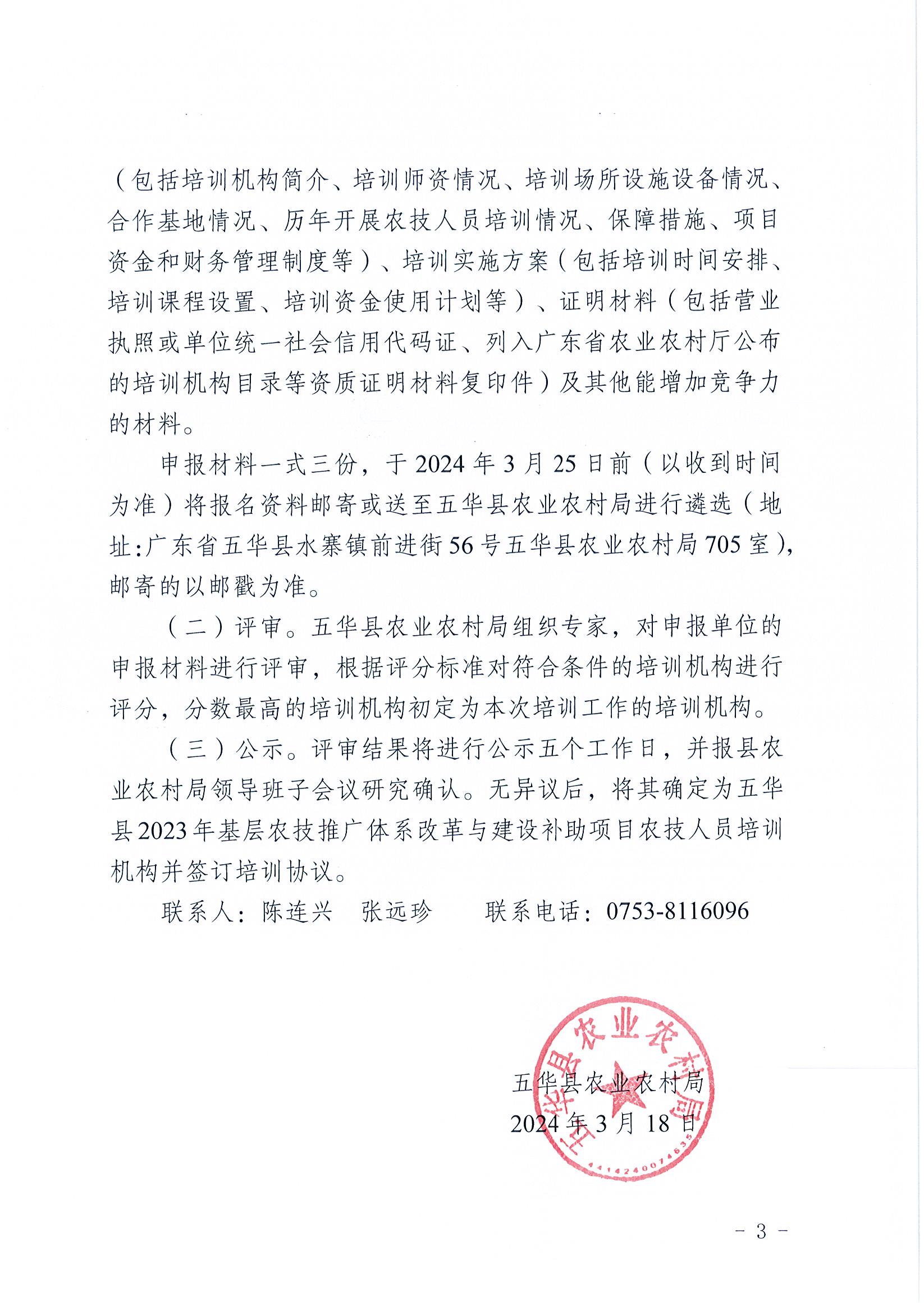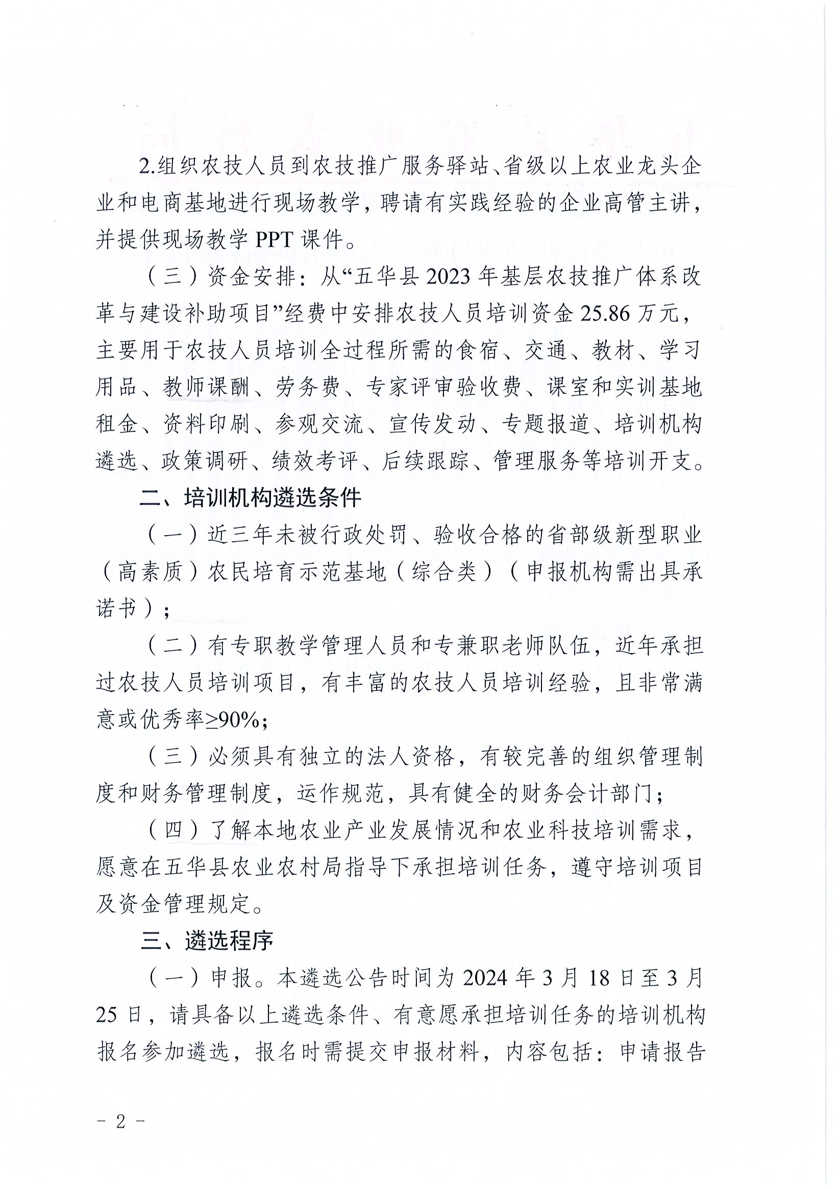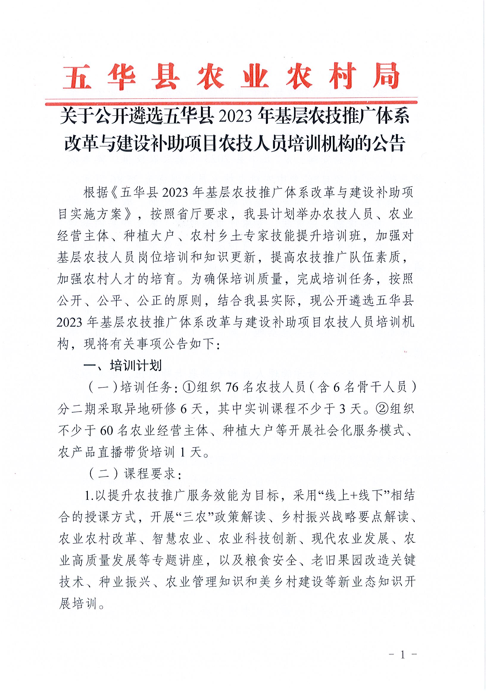 关于公开遴选五华县2023年基层农技推广体系改革与建设补助项目农技人员培训机构的公告
