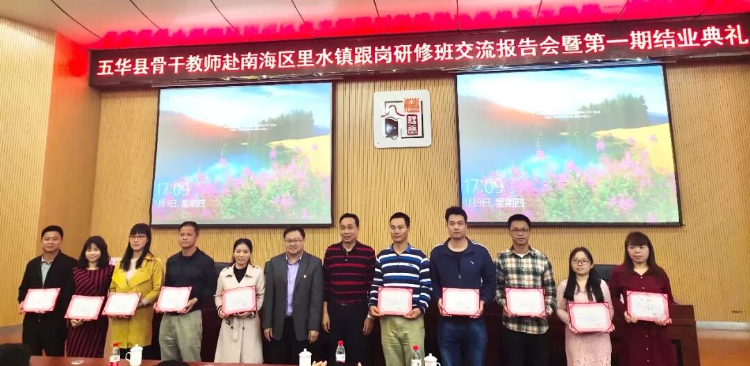 2020年1月9日下午,五华县骨干教师赴南海区里水镇研修班第一期结业典礼在南海区里水中学报告厅隆重举行。参加典礼的有五华县教育局长黄国标,研修班班主任曾焕威以及研修班四十位学员,出席典礼的还有特邀嘉宾里水镇教育局局长周友乔,办公室主任杨如琴。典礼由研修班班长孔全主持。
