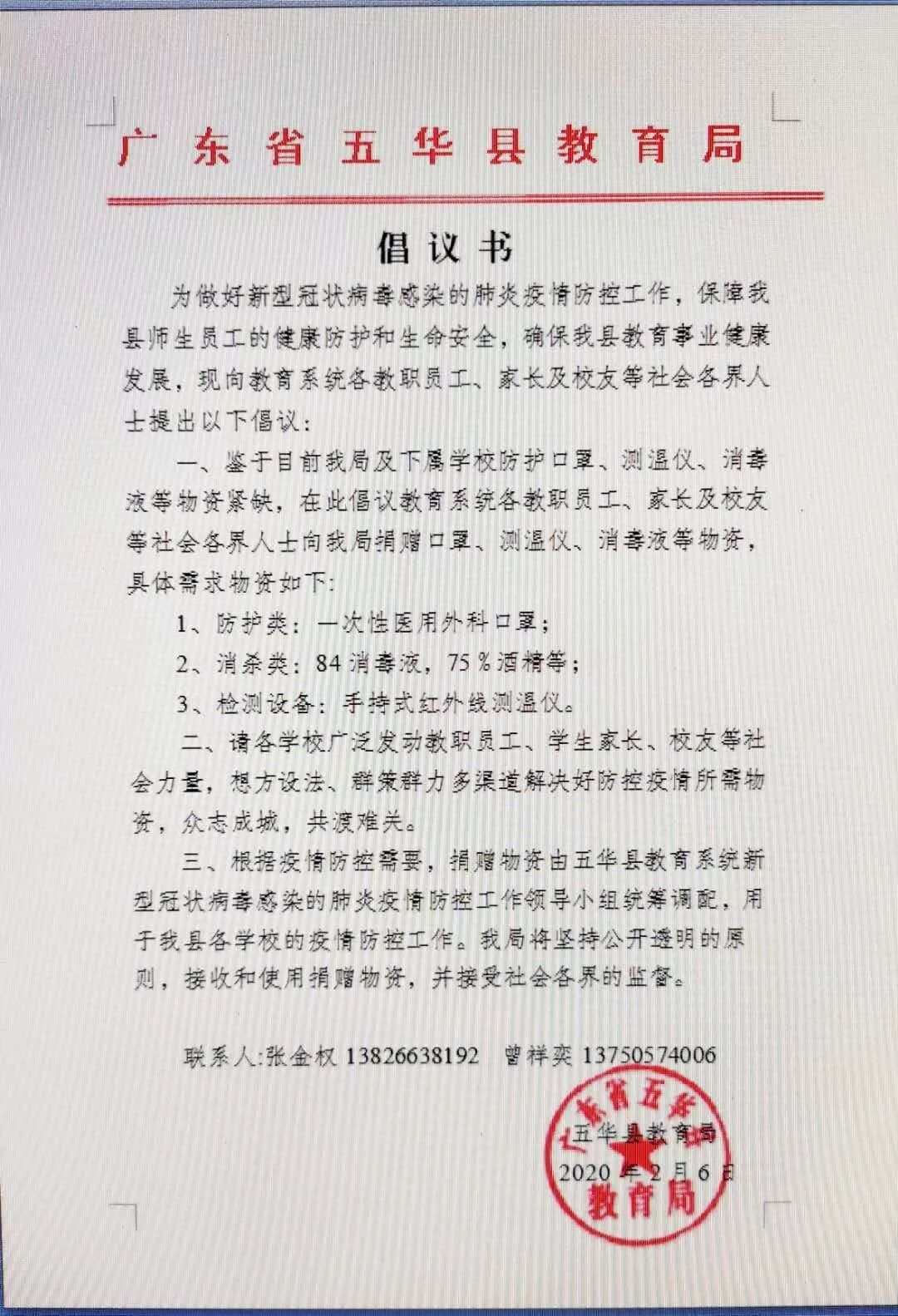 五是开展倡议捐款捐资志愿活动。鉴于目前教育局及下属学校防护口罩、测温仪、消毒液等物资紧缺,倡议教育系统各教职员工、家长及校友等社会各界人士发扬“伸出援助之手,奉献一片爱心”的志愿服务精神,向教育局捐赠口罩、测温仪、消毒液等物资。至目前,全县各学校84个单位(含教育局机关),捐款人数共11785人,捐赠总金额达914546.92元。| 五华县教育系统各校抗击疫情捐款汇总表 |