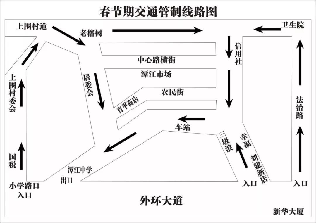 为保证春节期间潭下镇圩镇的道路畅通与交通安全,根据《中华人民共和国道路交通安全法》的有关规定,对潭下圩镇道路交通实行汽车单向通行,具体如下:
