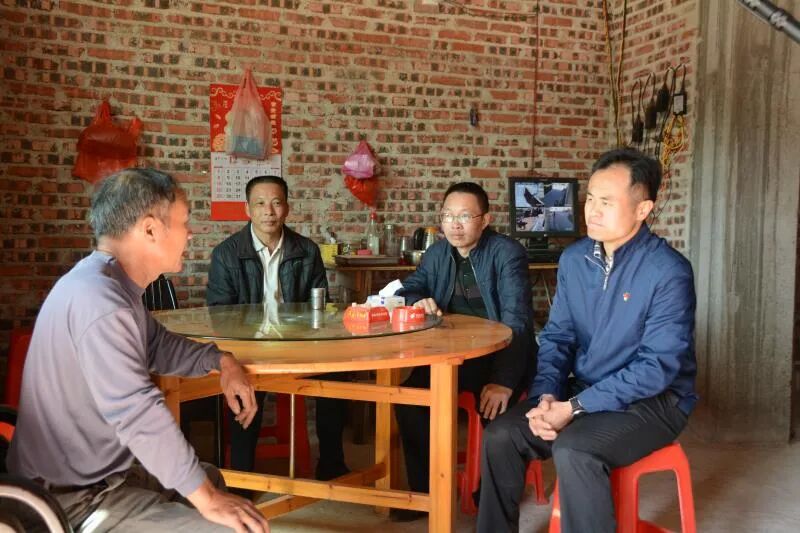 里塘村帮扶工作队队长兼第一书记谢沁华(右一)与陈义(右二)到贫困户家中了解生活状况