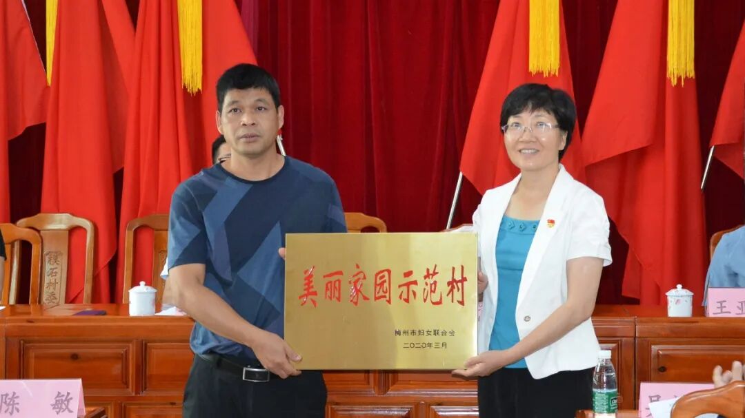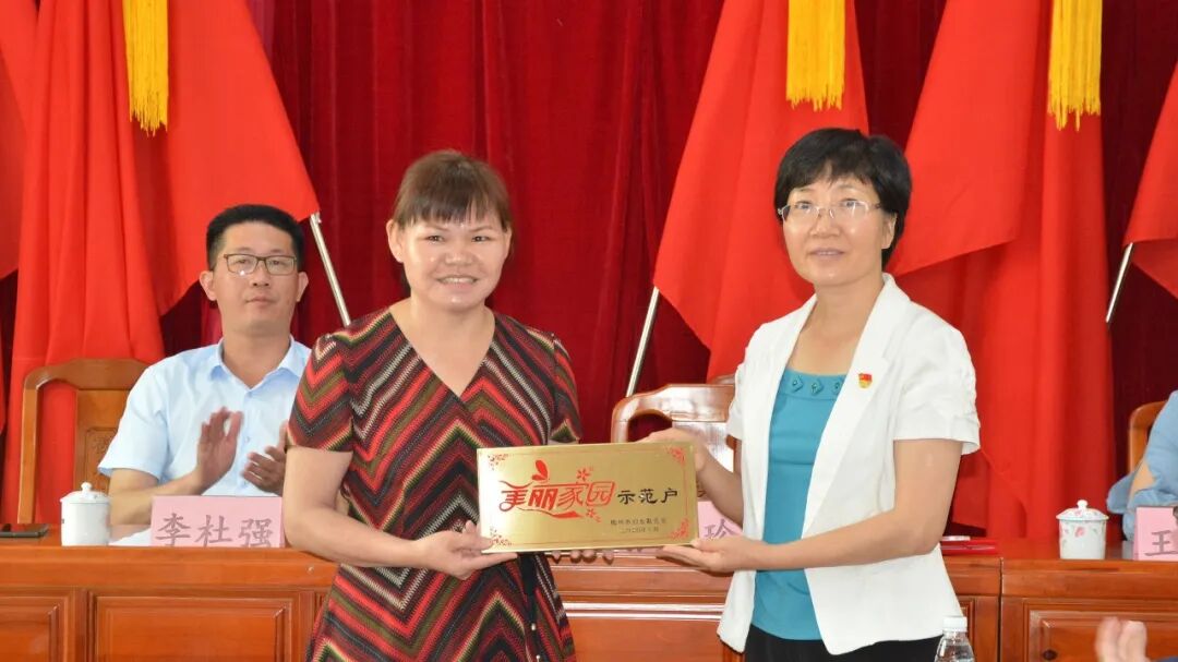 在授牌仪式上,张玉珍为获得梅州市“美丽家园示范村”荣誉称号的潭下镇模石村授牌,为获得梅州市“美丽家园示范户”、县“美丽庭院示范户”的廖碧娟家庭授牌并颁发荣誉证书。