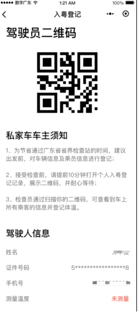 到达检查站,驾驶员在“粤省事”的“入粤登记记录”找到对应记录,出示对应乘车二维码,检查员扫码核验,待检查员测量全车人员体温、提交信息后通过。