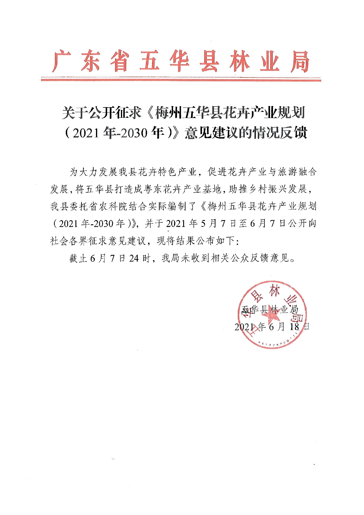 关于公开征求《梅州五华县花卉产业规划(2021年-2030年)》意见建议的情况反馈