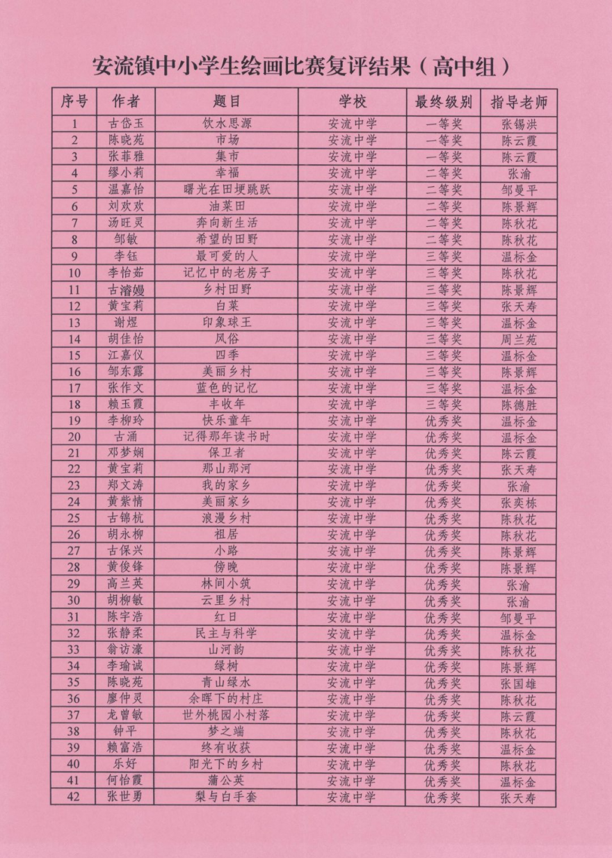 前期经过组织五华县美协专家组进行初评,共评出470件绘画作品进入复评。经广东省自然资源厅事务中心联合五华县美协专家组对入围的470件作品进行复评,共评出378件获奖作品,其中:小学低年级组71幅(一等奖3幅,二等奖5幅,三等奖10幅,优秀奖53幅);小学高年级组78幅(一等奖3幅,二等奖5幅,三等奖10幅,优秀奖30幅);初中组130幅(一等奖3幅,二等奖5幅,三等奖10幅,优秀奖112幅);高中组97幅(一等奖3幅,二等奖5幅,三等奖10幅,优秀奖79幅)。现将获奖结果公示如下: