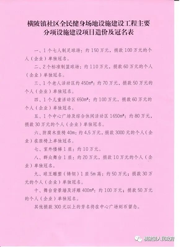 为提高人民的身体素质,丰富群众的文化生活,我镇对原横陂人民体育场进行升级改造,建设成全民健身场地设施(球王公园)。该项目自开工以来,社会各界热心人士大力关心支持横陂建设,踊跃捐款献力,现将捐款芳名(第二榜)公布如下。如有遗漏,请与陈艳庭同志联系,联系电话:15218101039。
