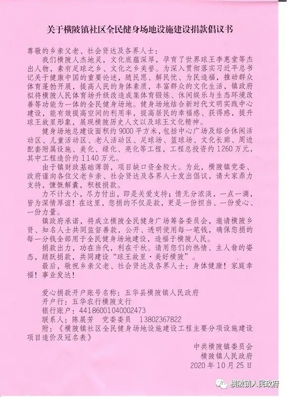 捐款筹集工作仍在进行时,横陂镇党委、政府在此呼吁广大父老乡亲和社会各界人士继续慷慨解囊,积极捐款,支持参与全民健身设施建设,为建设“球王故里·美好横陂”奉献一份力量。