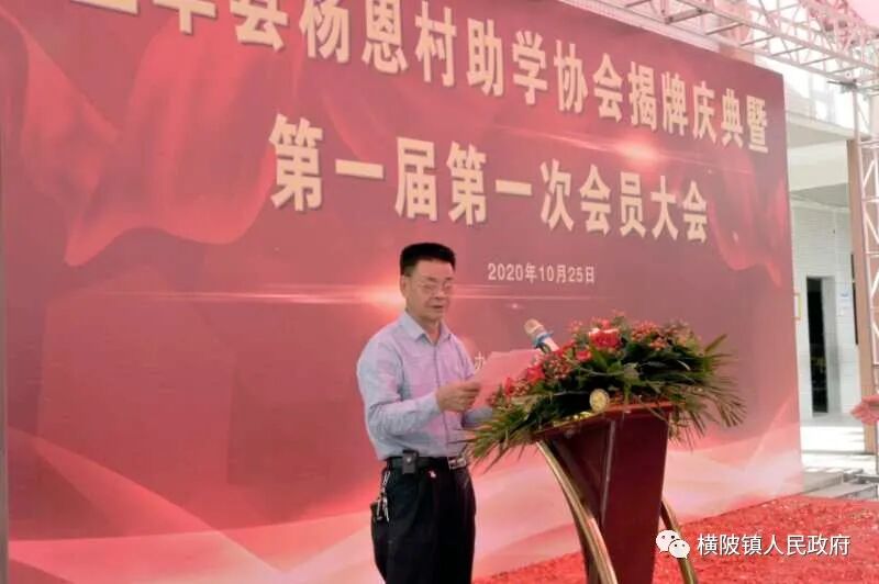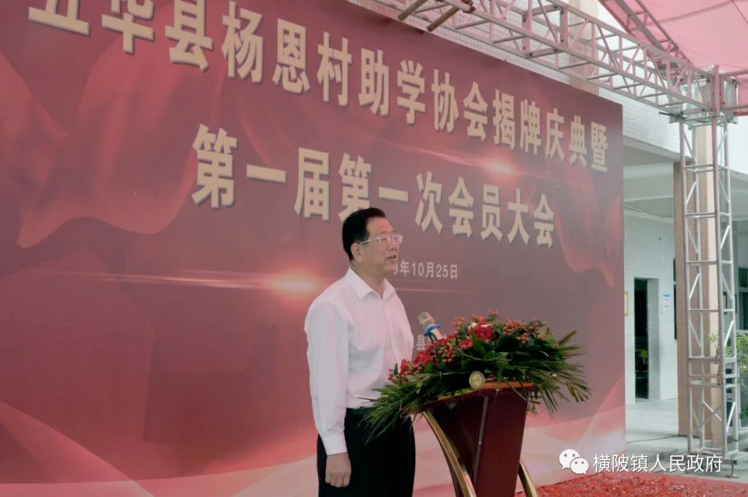 10月25日,在横陂镇杨恩村恩仔小学举行了杨恩村助学协会揭牌庆典暨第一届第一次会员大会。县人大常委会主任邓伯锦、县人大常委会副主任李永浩、县人大农工委主任魏少洲、县教育局局长黄国标,横陂杰出乡贤魏标辉、魏云良、魏思瑶等出席了大会。大会由镇长卓伟强主持。