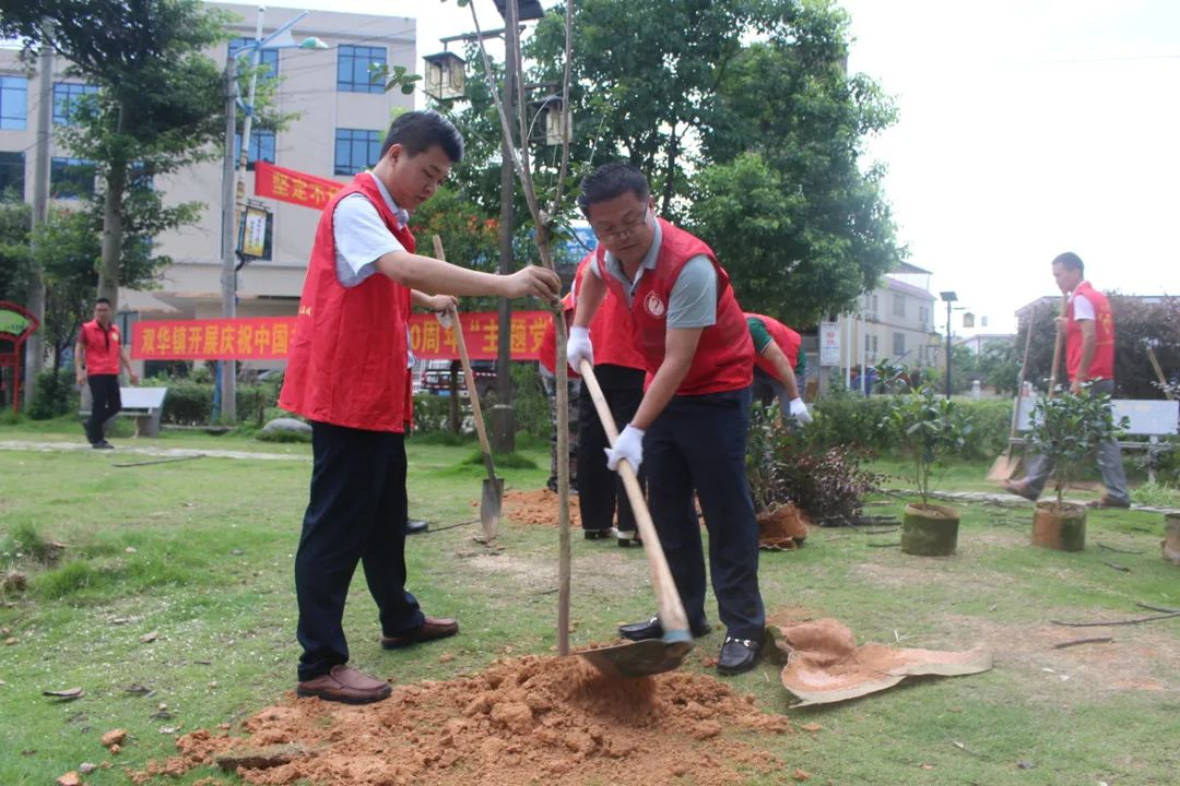 7月1日下午,双华镇组织机关党员前往镇政府门前小公园以栽植新绿的方式,共建美丽双华,共护青山绿水,庆祝中国共产党成立100周年。