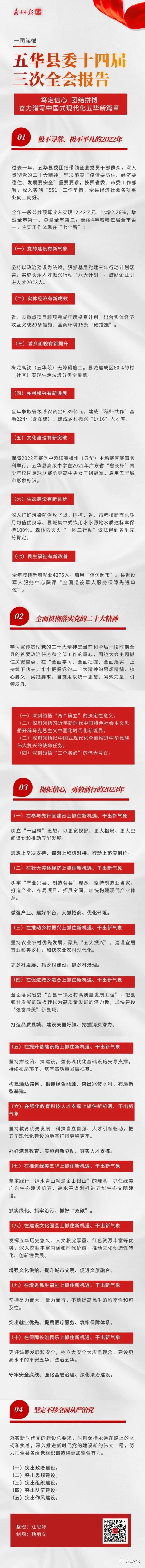 1月11日,中国共产党五华县第十四届委员会第三次全体会议召开。五华县委书记朱少辉代表县委常委会向全会作题为《笃定信心 团结拼搏 奋力谱写中国式现代化五华新篇章》的工作报告,总结2022年工作,部署2023年工作,动员全县上下在新征程上进一步笃定信心、勇毅前行,守正创新、团结奋斗,推动五华苏区加快振兴、共同富裕,奋力谱写中国式现代化五华新篇章。