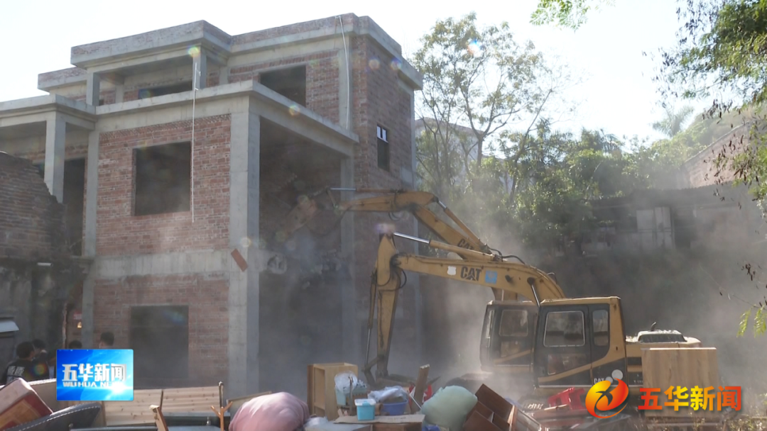 在拆除现场,各个工作组严阵以待。伴随着机械强力破拆的轰鸣声,位于水寨镇大岭村的一处违法建筑应声而倒。