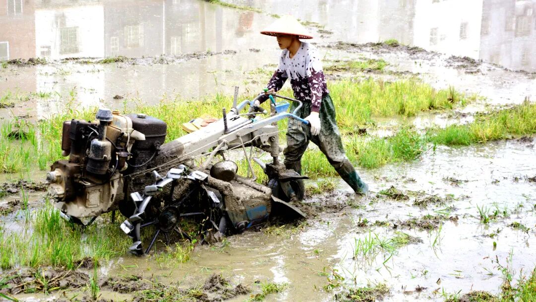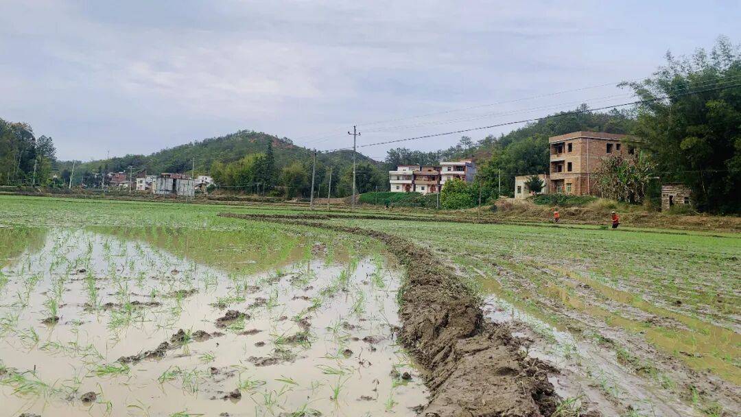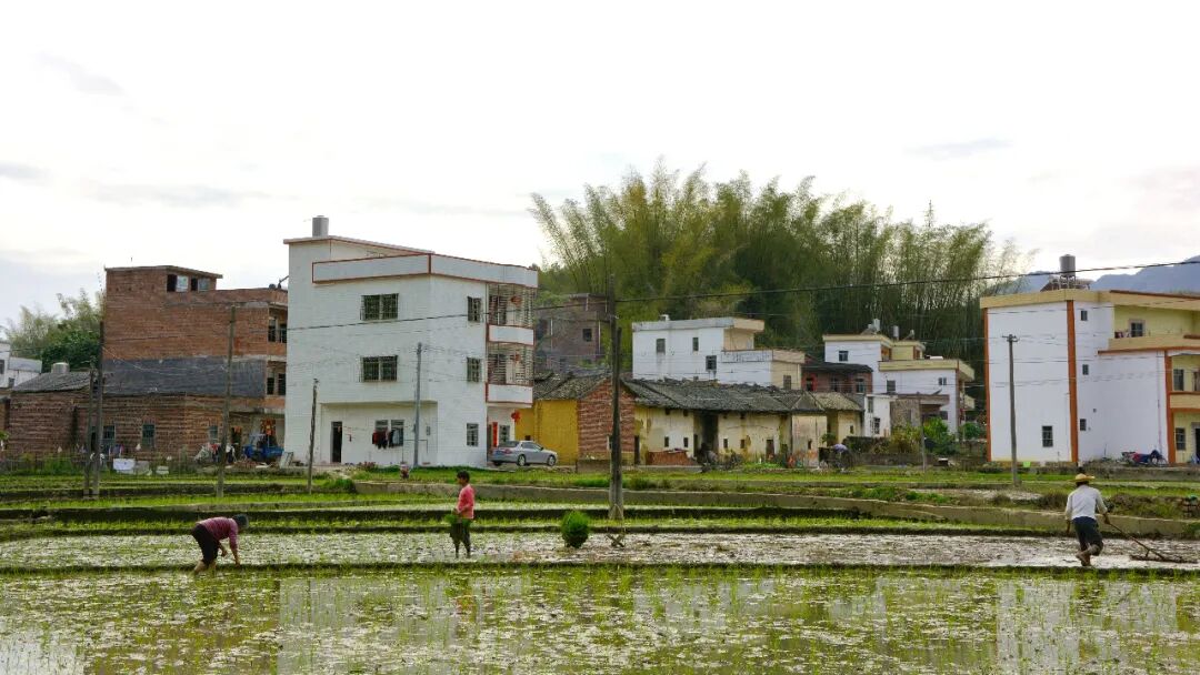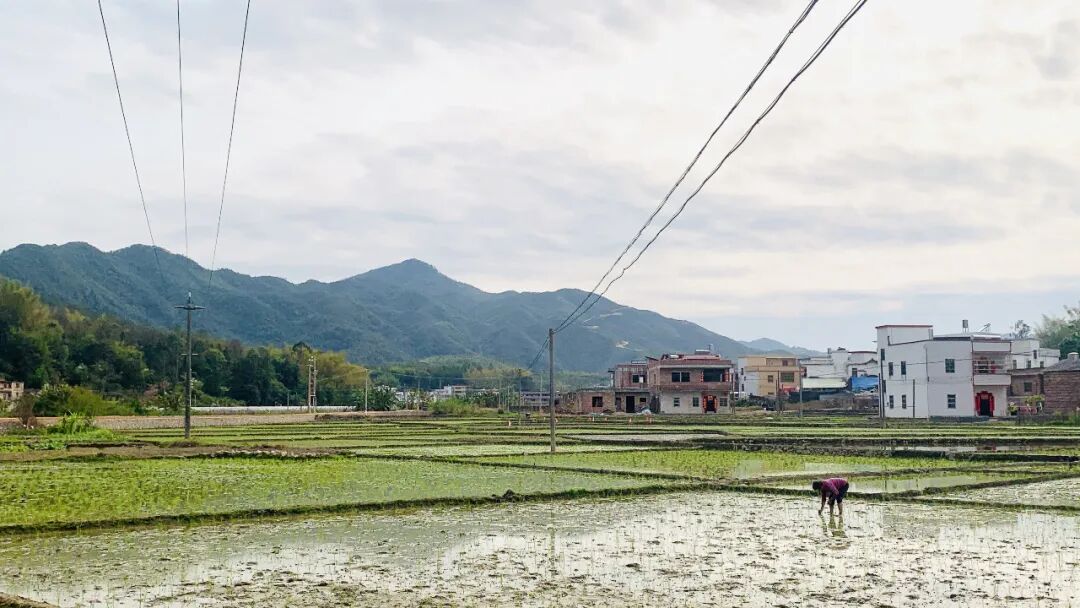 三两成群的孩子手提秧苗欢快的行走在田埂上