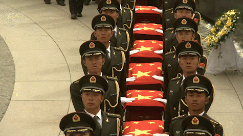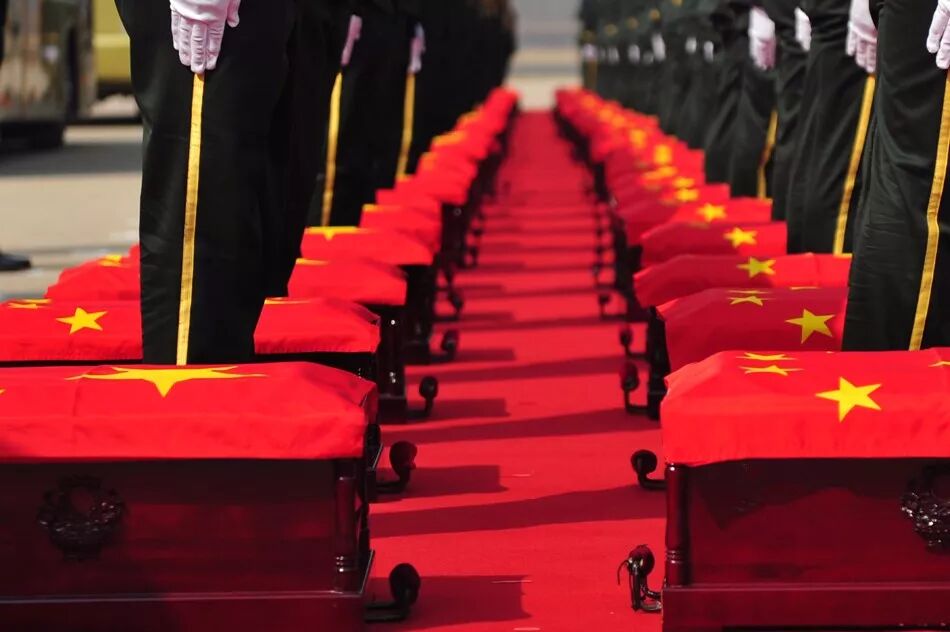 中国驻韩大使为志愿军烈士遗骸棺椁覆盖国旗▼