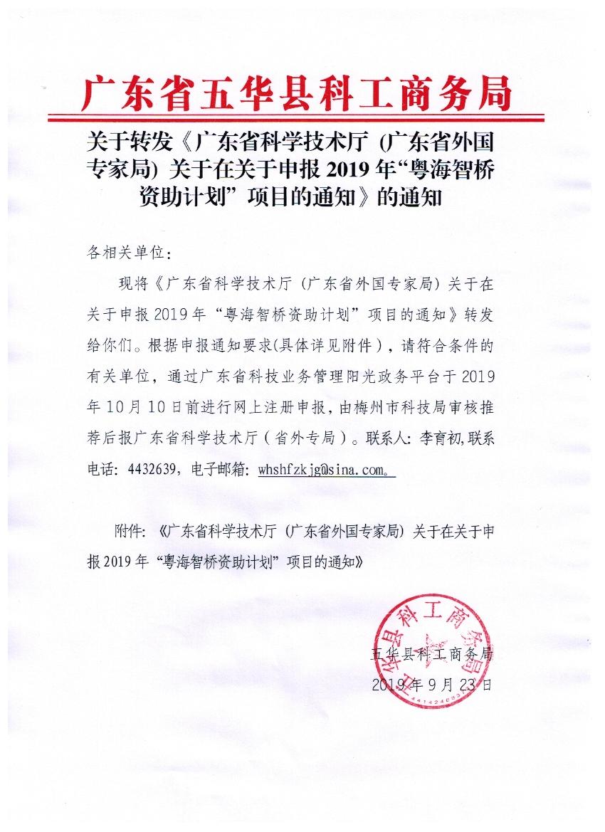 关于转发《广东省科学技术厅 (广东省外国专家局) 关于在关于申报2019年“粤海智桥资助计划”项目的通知》的通知