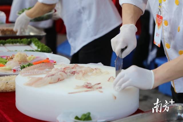 比赛现场气氛热烈,叫好声与刀具轻落的声音交织成独特的“美食交响乐”。选手们有条不紊地处理鲜活草鱼,指尖翻飞间,鱼鳞快速脱落;精准下刀时,鱼骨与鱼肉完美分离;手持薄刀切片,每一片鱼肉都薄厚均匀、纹理清晰。最后搭配各色配料,或错落摆放、或环绕点缀,让每一份鱼生作品都兼具舌尖美味与视觉美感。与此同时,比赛现场还通过客家话、普通话双语直播,实时呈现比赛盛况与鱼生制作亮点,让广大网友沉浸式感受五华鱼生的独特魅力。