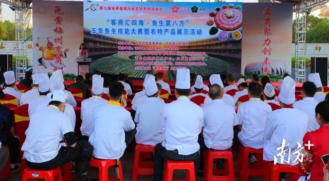 11月24日下午,第七届世界客商大会五华系列活动——“客商汇四海·鱼生宴八方”五华鱼生技能大赛在五华奥体中心广场举行。现场30余家餐饮企业的顶尖大厨同台献技,以一把薄刀、一方案台、一尾鲜鱼,演绎客家饮食文化的匠心传承与创新活力。