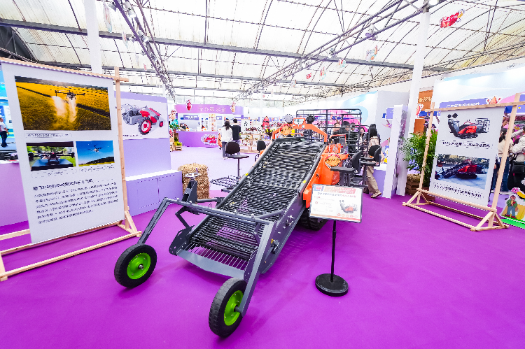 广东薯业全产业链成果展展示新产品——自走式薯类联合收获机。