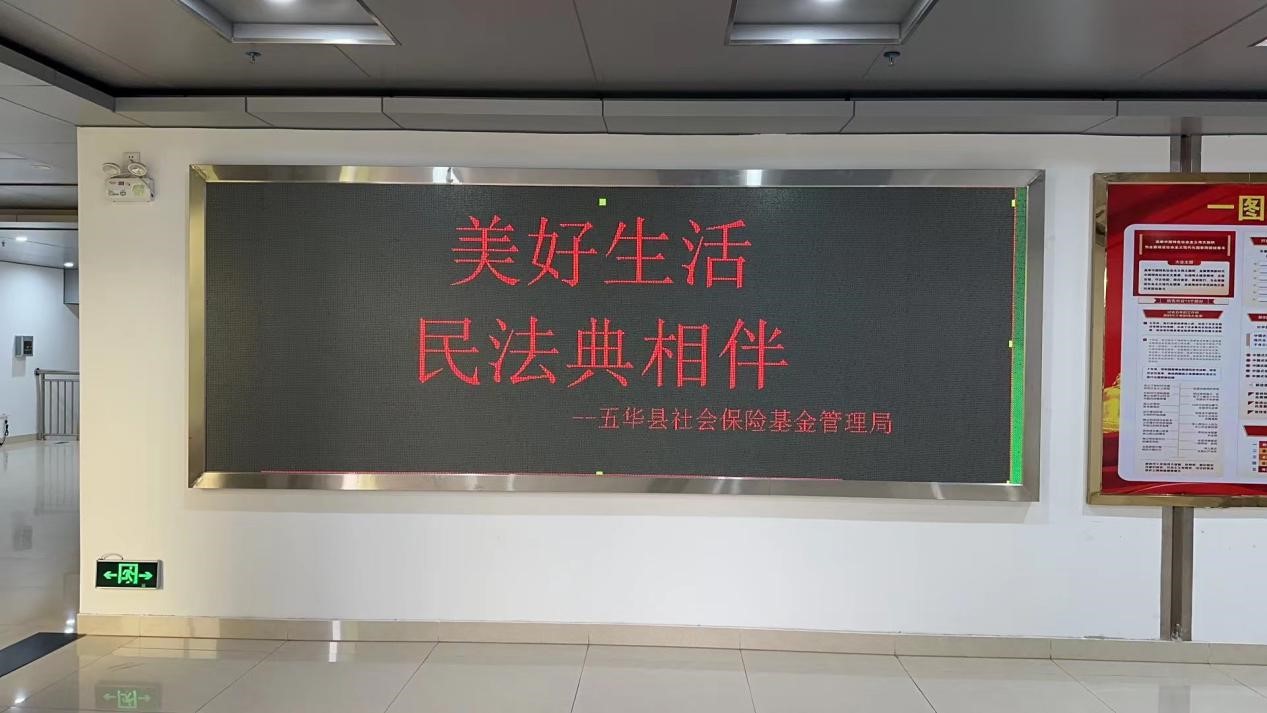 县社保局LED电子显示屏滚动播放宣传民法典标语。