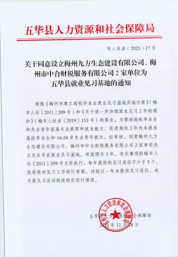 关于同意设立梅州九方生态建设有限公司、梅州市中合财税服务有限公司2家单位为五华县就业见习基地的通知