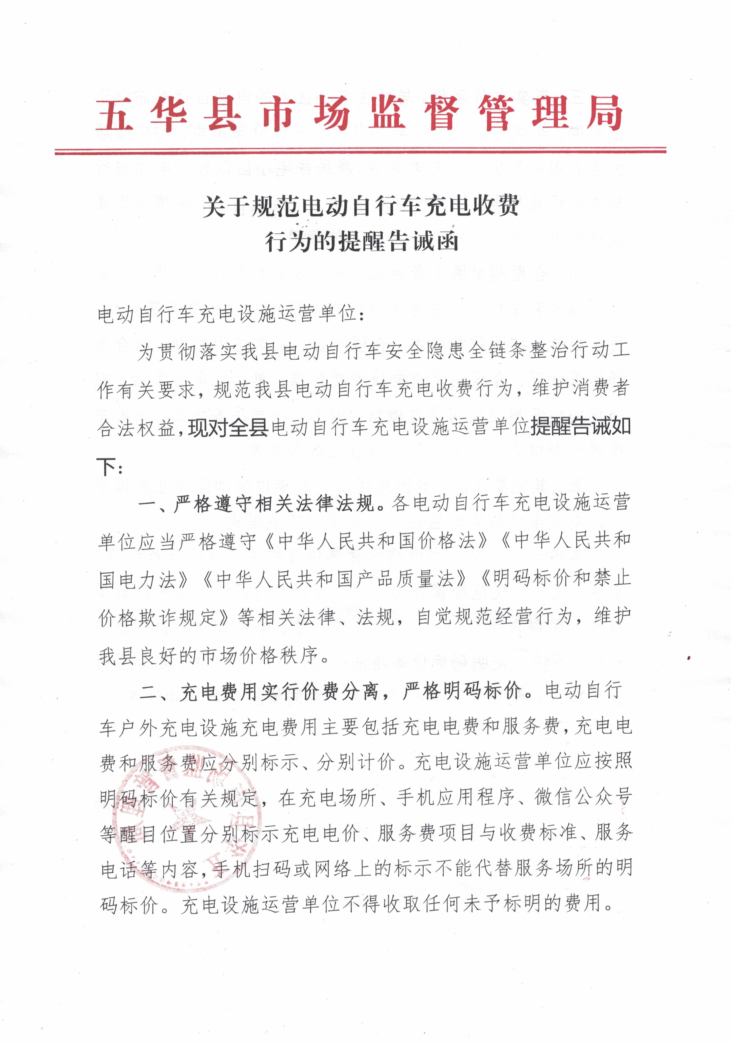 关于规范电动自行车充电收费行为的提醒告诫函