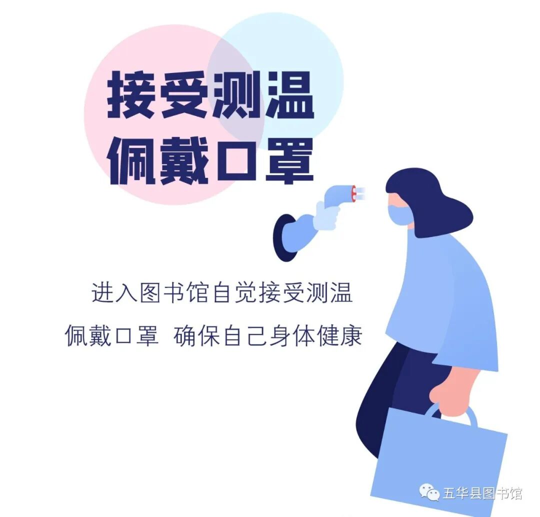 为满足广大市民开展文化活动的需求,根据国家、省、市、县有关疫情防控和复工复产的精神及相关专业指引,五华县图书馆将于2020年3月31日起有序恢复开放,实施限时限流服务,具体通知如下: NO.1 入馆需知 1、读者统一从大门进出,在大门入口排队测温并登记(间隔不少于1.5米),体温正常(<37.3℃)且佩戴口罩方可入馆。 2、如体温异常(≧37.3℃)或有明显呼吸道症状的读者,须到馆外体温复测点观察,如复测后仍异常,谢绝入馆。 3、为防止人员密集造成交叉感染,采取进馆人数总量控制,上午、下午各接待50人次,日接待总量不超过100人次(不含跟随家长进馆的14周岁以下未成年人,每位成年人最多陪同一名14周岁以下未成年人进馆),超过人员另日再来,请予配合。 4、疫情期间图书馆暂时只为持证读者提供图书外借和归还服务(提倡读者使用自助借阅机借还图书),暂不提供现场办证、书刊阅览、自习、展览、参观等服务;读者办理完借还书手续后请及时离馆。 5、我馆暂不提供私人物品寄存服务,进馆读者请自行妥善保管私人物品。 6、读者在馆期间须全程佩戴口罩,禁止在馆内进食,借书过程请勿聚集,保持安全距离(不少于1.5米)。