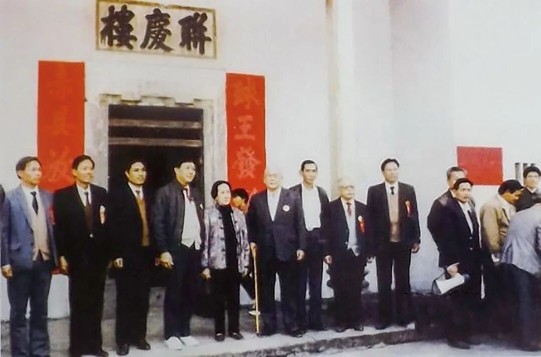 1990年12月,李惠堂夫人廖月英(左五)出席五华县举办“世界球王李惠堂研讨会”,并在李惠堂故居联庆楼前合影。