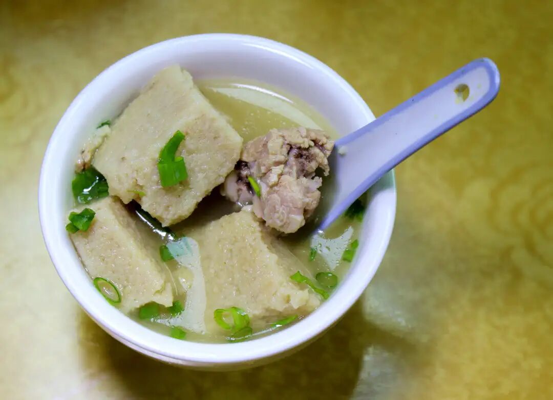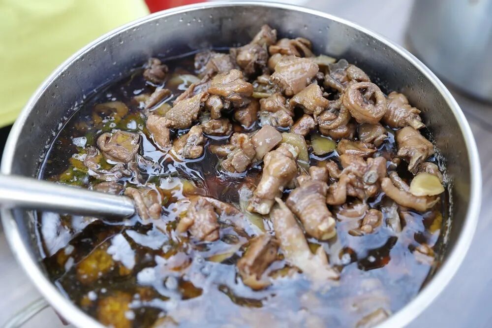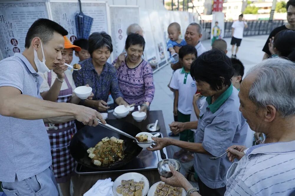 随后,县非遗保护中心的工作人员端来了地道的义学客家老酒炒鸡和毛糕猪骨汤,刚一揭盖,浓郁的酒香和汤的鲜味立刻让现场群众沸腾起来,吸引了大量群众围观品尝。