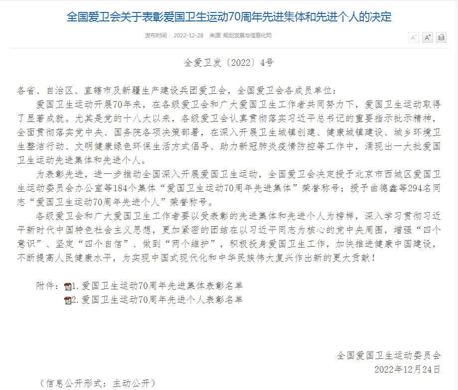 2022年是爱国卫生运动70周年。12月24日,全国爱卫会印发了《全国爱卫会关于表彰爱国卫生运动70周年先进集体和先进个人的决定》,全国共184个集体和294名个人被表彰为爱国卫生运动70周年先进集体和先进个人。