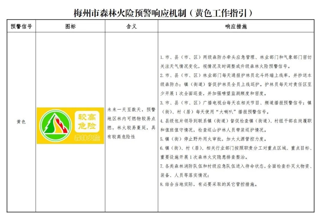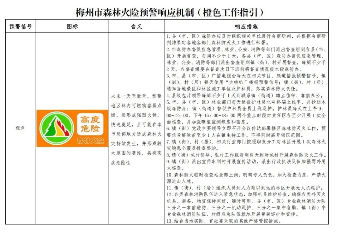 23日,据气象部门预测,未来一段时间梅州市干燥少雨天气持续,受冷空气影响风力加大,森林火险等级将进一步升高,极易引发森林火灾。各地各有关单位要密切关注森林火险等级变化,根据相关工作指引,严格落实森林防火应急响应措施,持续加强火源管控,强化应急准备,做到早发现早处置,确保梅州市在关键时期不发生森林火灾。