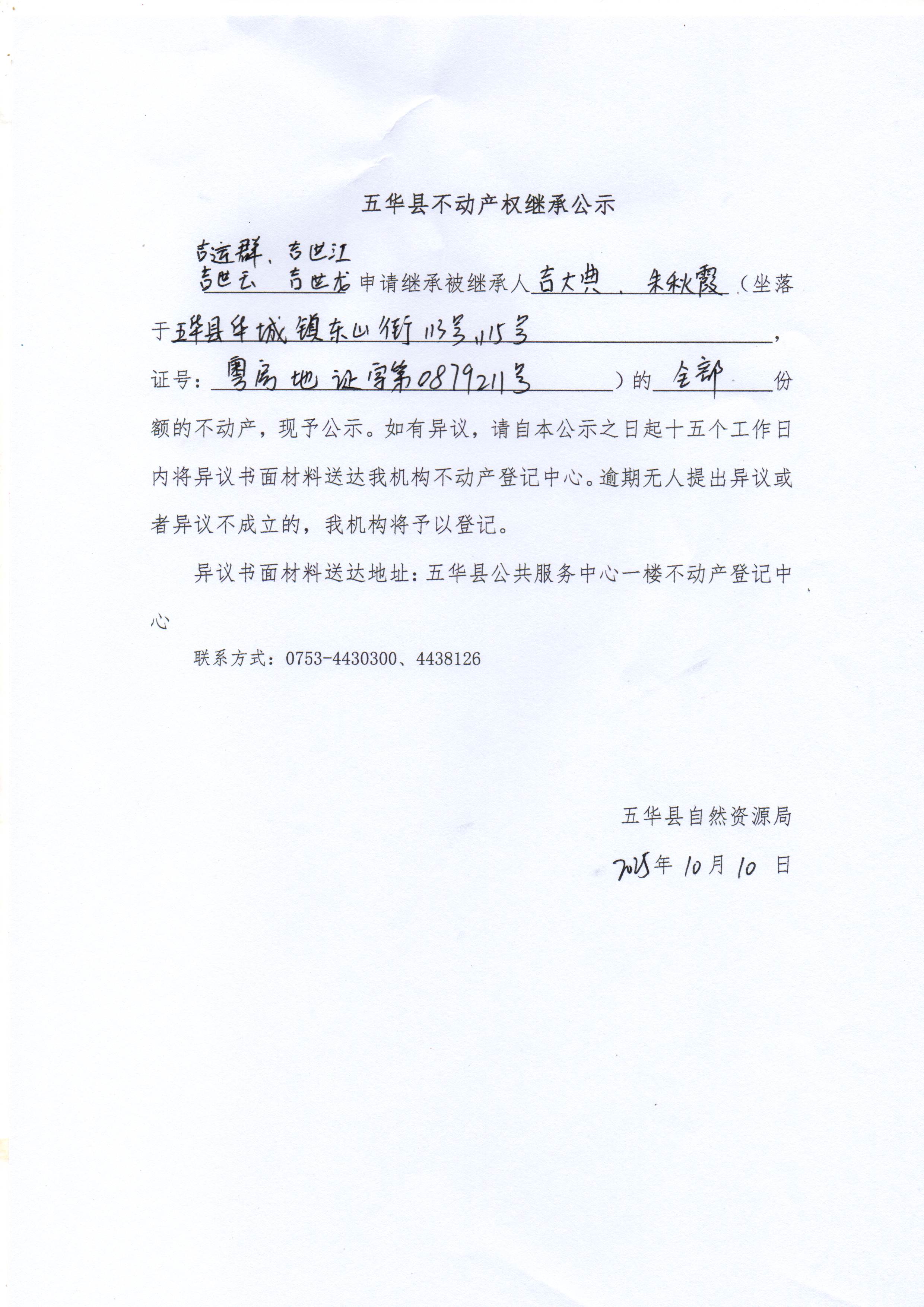 五华县不动产权继承公示(吉大典、朱秋霞)