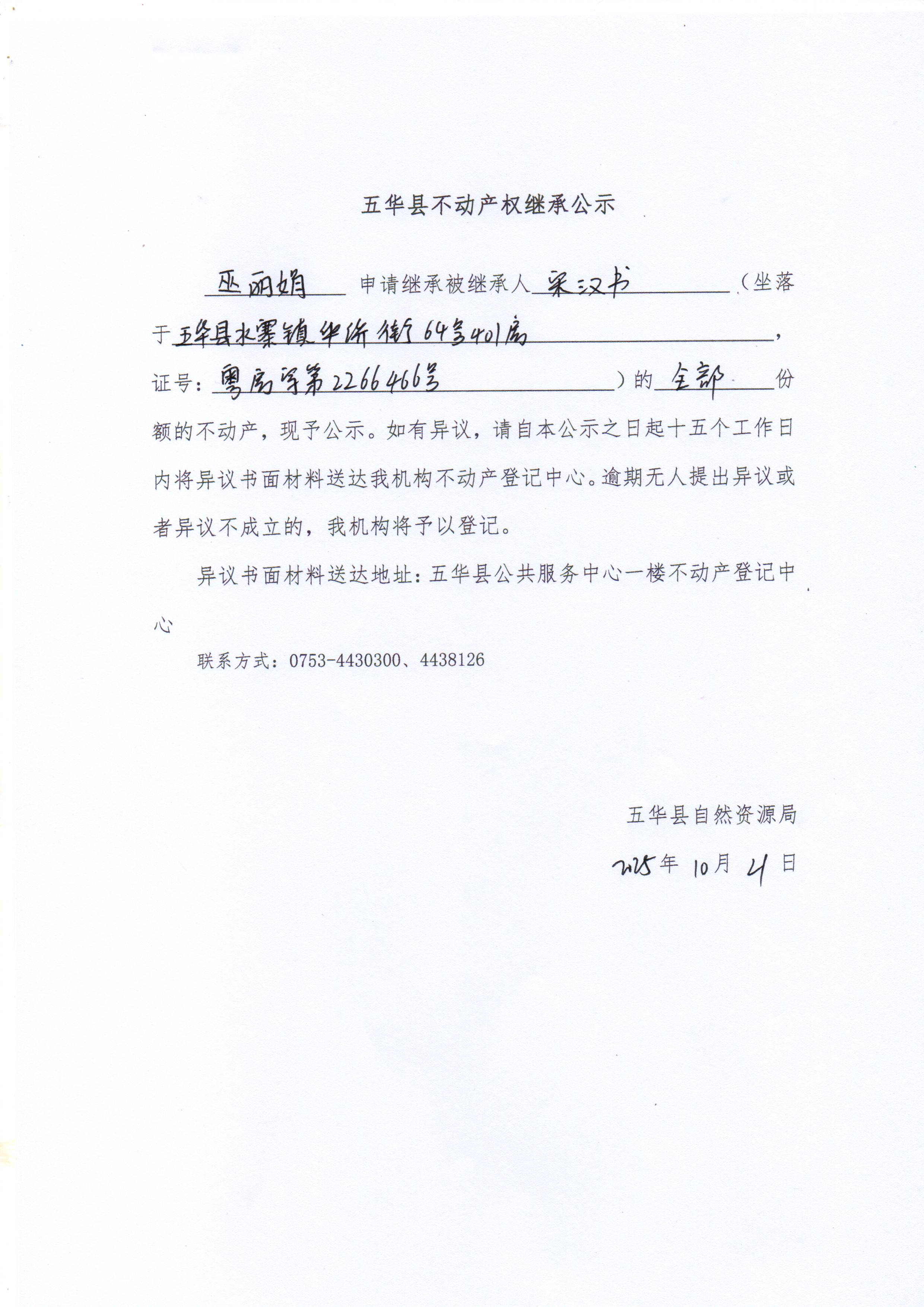 五华县不动产权继承公示(宋汉书)