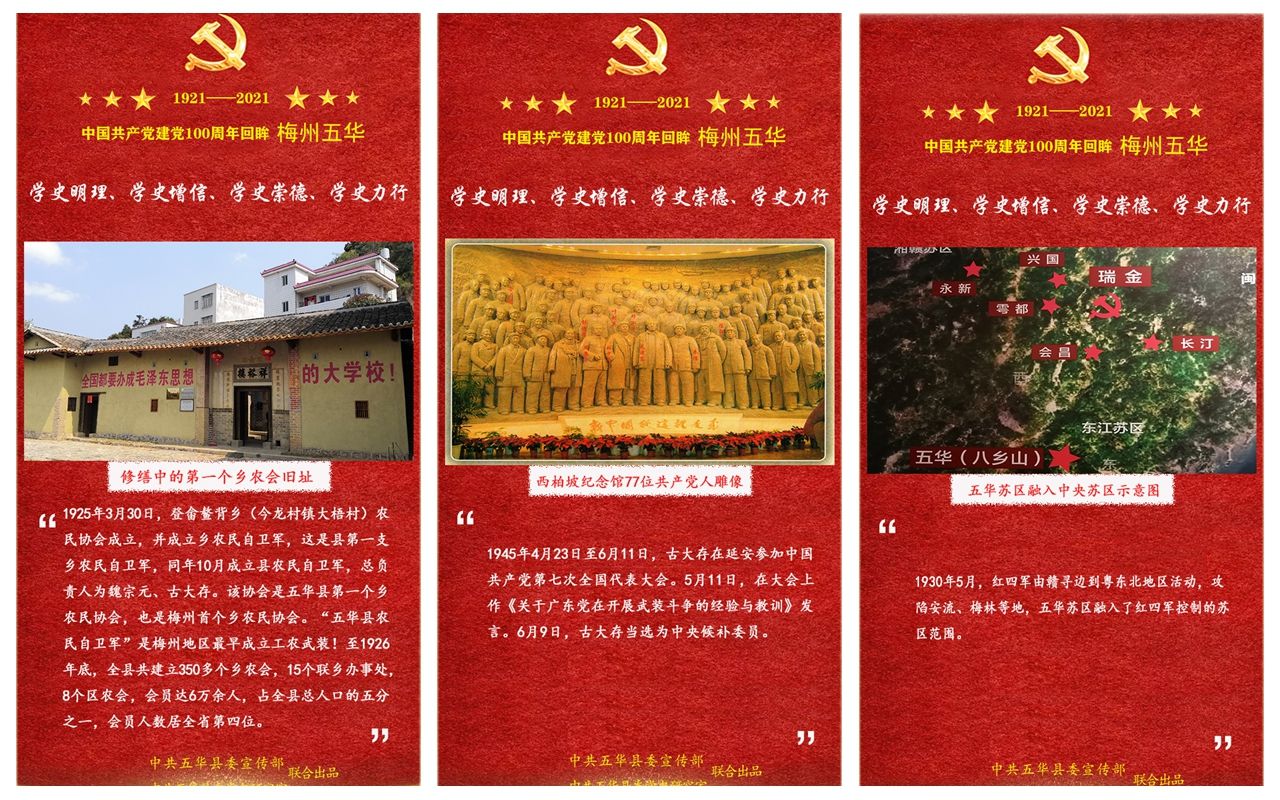 为此,五华县党史学习教育领导小组在贯彻落实好上级部署的同时,深入挖掘五华丰富的红色革命历史,以事件为纲、事件发生时间为经纬,从今年2月中旬开始策划设计红色专题海报。海报版式尺寸设计以适配手机屏幕,版面以红色为主色调,金色党徽置于版面正上方,下置“1921——2021”字样并点缀六颗五角星,“中国共产党成立100周年回眸梅州五华”突出学习的内容是五华当地的党史,“学史明理、学史增信、学史崇德、学史力行”16个字大二号字体单独成行,彰显党史学习教育这一主题,剩下大约三分之二的版面,以图文并茂的形式讲述某一事件。