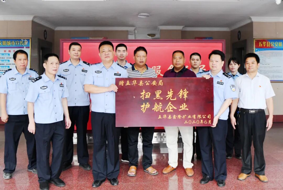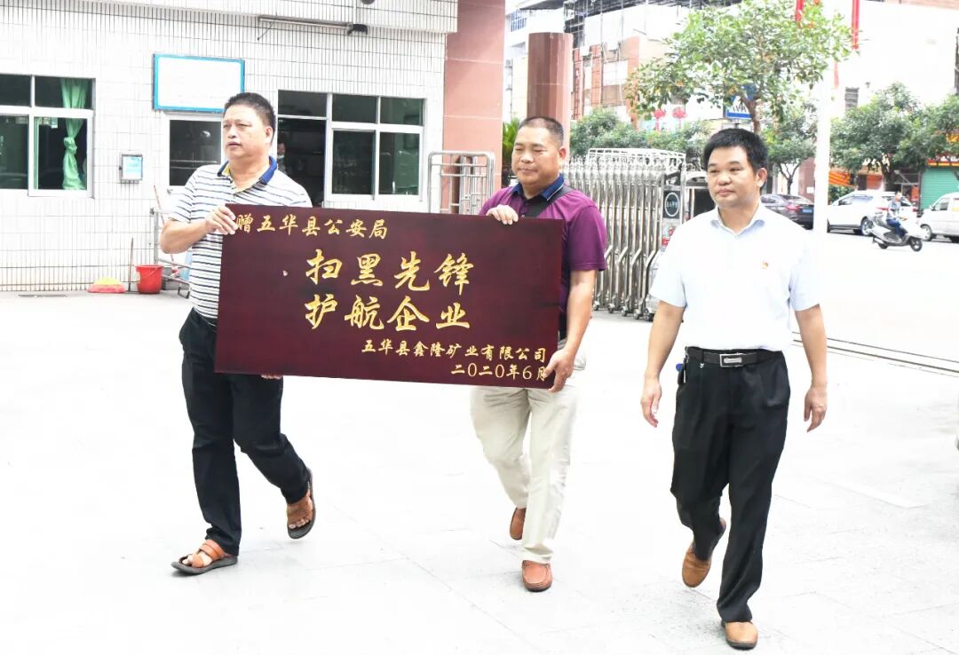 日前,五华县鑫隆矿业有限公司代表来到五华县公安局,把一面题为“扫黑先锋,护航企业”牌匾送到公安局,感谢五华公安在扫黑除恶专项斗争中狠刹黑恶分子嚣张气焰,为企业发展保驾护航。