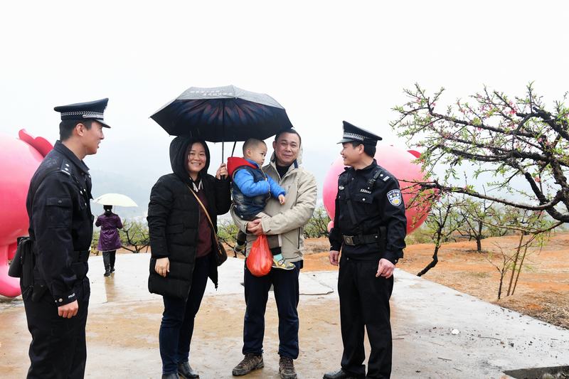 “老伯,天雨路滑,请您移步到安全区域观看桃花。”上午10点左右,正在现场执勤的潭下派出所教导员甘喜君忙碌地疏导游客。“喜君,喜君。”这时他一回头,才发现妻子带着女儿站在了背后,“咦,你怎么来啦?”“我还不能来吗?”“不不不,这不是太忙啦,没时间陪你去赏花啊。”原来,由于近期工作任务需要,甘喜君已经近半个月没有回家,女儿太过想念爸爸,于是妻子就带着孩子偷偷来到桃花源现场,看一看执勤的甘喜君。几句闲聊之后,甘喜君又带队巡逻去了。